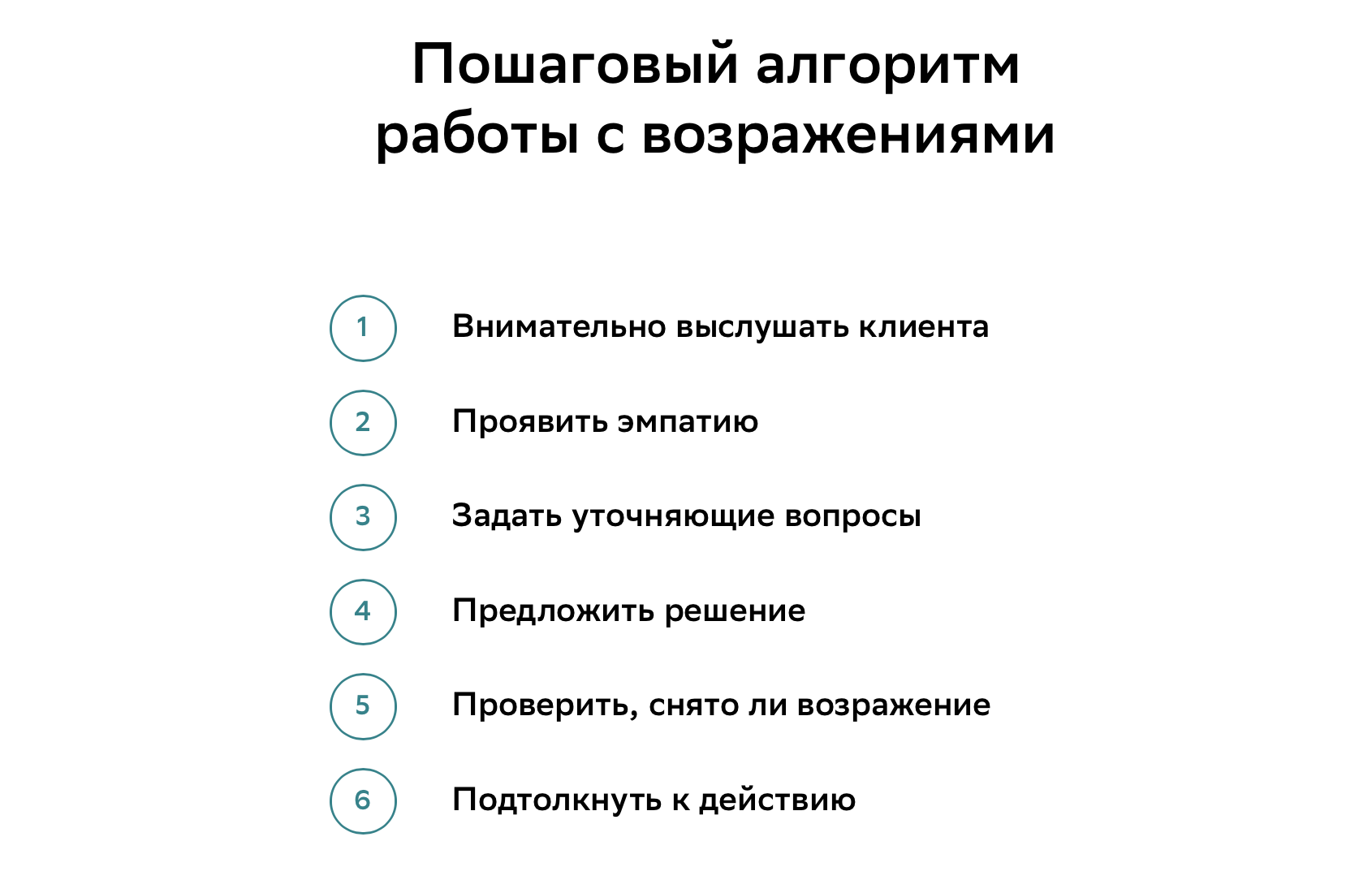 Эффективная работа с возражениями — это не импровизация, а последовательный процесс, состоящий из нескольких ключевых шагов. Соблюдение этого алгоритма помогает продавцу уверенно вести диалог и успешно отрабатывать возражения.