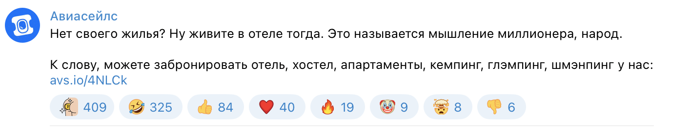 - Авиасейлс: компания известна своим дерзким и юмористическим стилем общения с аудиторией. Их слоганы и рекламные посты в социальных сетях часто становятся вирусными.