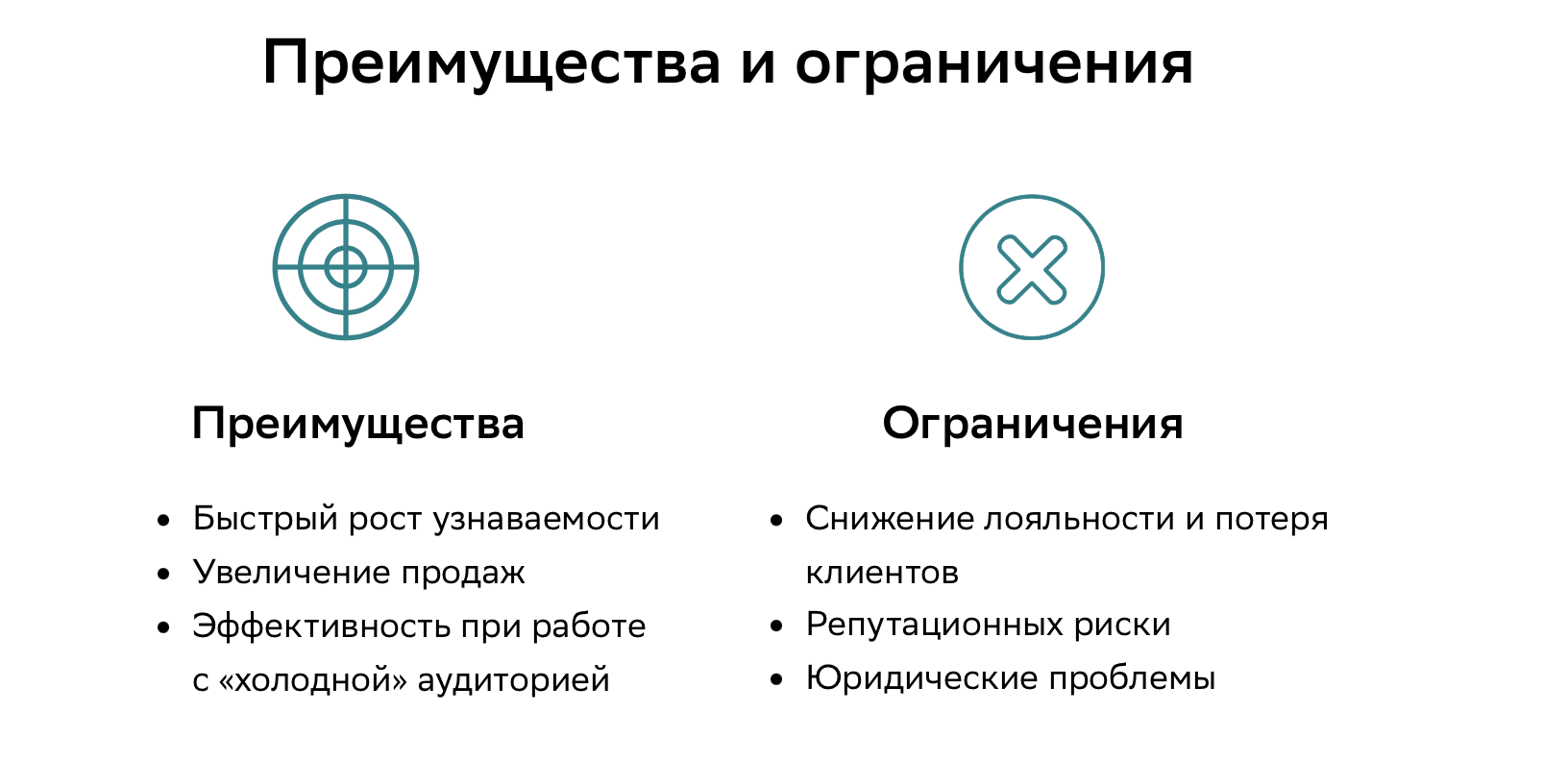 Как и любой другой маркетинговый инструмент, агрессивный маркетинг имеет свои сильные и слабые стороны. Прежде чем решиться на его использование, необходимо взвесить все «за» и «против».