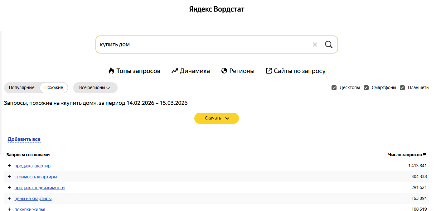 Яндекс Вордстат — это статистика по запросам. Но программа показывает данные не только по конкретной фразе, а по всем словоформам, похожим тематическим запросам. Именно поэтому он активно используется для сбора семантики при настройке рекламы в Яндекс Директе и при оптимизации структуры сайта.