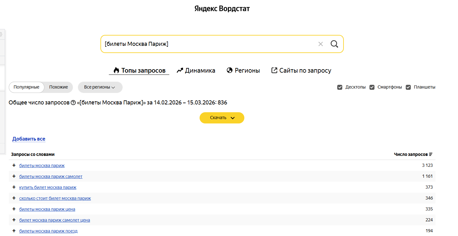 Этот оператор фиксирует порядок слов в запросе, но при этом учитывает все словоформы и стоп-слова. Он незаменим, когда порядок слов меняет смысл. Например, запрос [билеты Москва Париж] покажет статистику именно по этому порядку следования, не смешивая ее с запросами типа «билеты Париж Москва».
