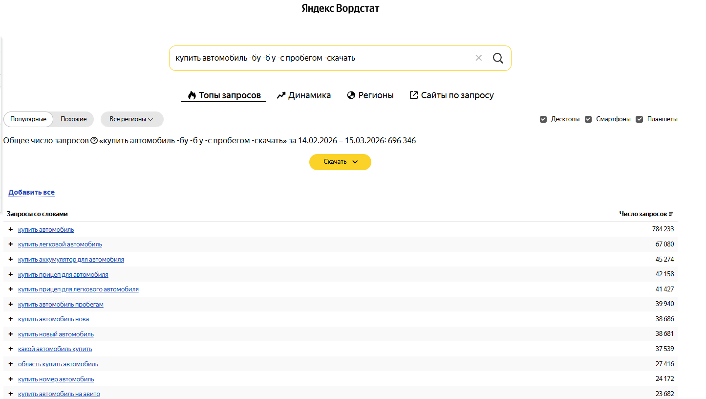 Оператор «минус» помогает исключить ненужные слова из выдачи. Это прообраз минус-слов в контекстной рекламе. Если вы продаете новые автомобили, ваш запрос будет выглядеть так: купить автомобиль -бу -б у -с пробегом -скачать. Все фразы, содержащие слова после минуса, не попадут в статистику.