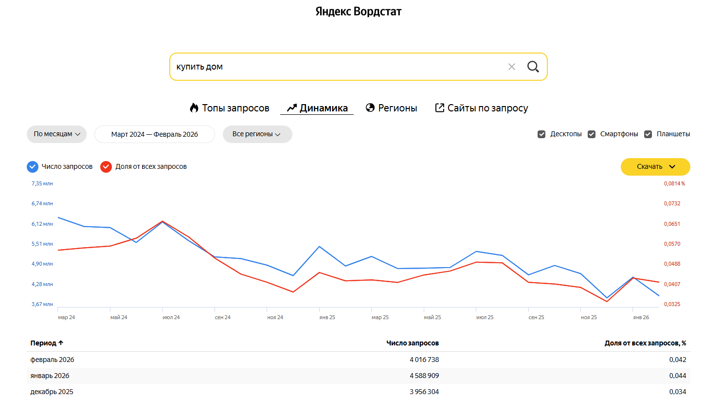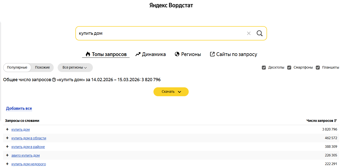 Яндекс Вордстат — это бесплатный и незаменимый инструмент для всех, кто работает с поисковым трафиком. Если вы хотите понять, что именно ищут ваши потенциальные клиенты в интернете, этот сервис станет вашей отправной точкой. С его помощью можно узнать точное количество запросов в Яндексе по словам, проанализировать интерес аудитории и грамотно подобрать ключевые запросы для SEO1-продвижения, контекстной рекламы или создания контента.