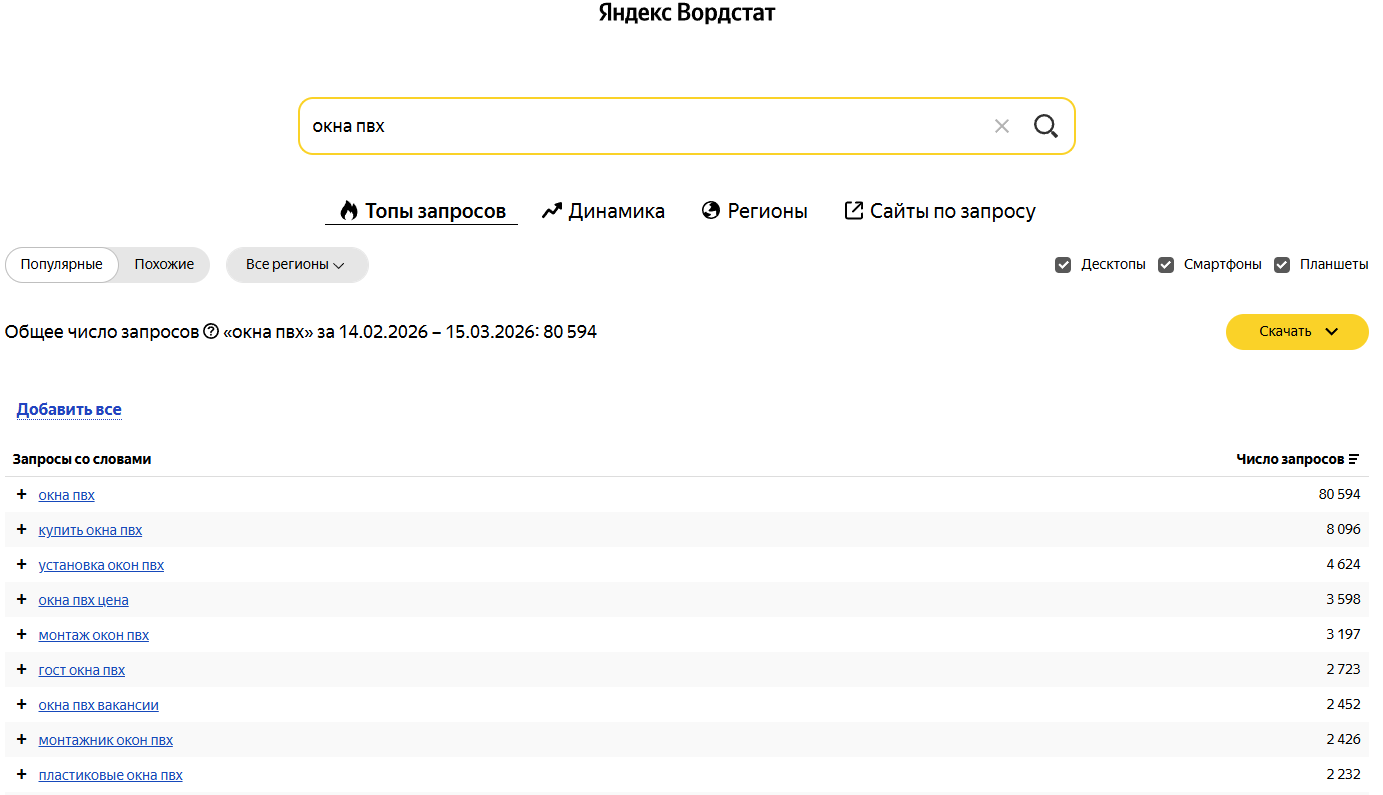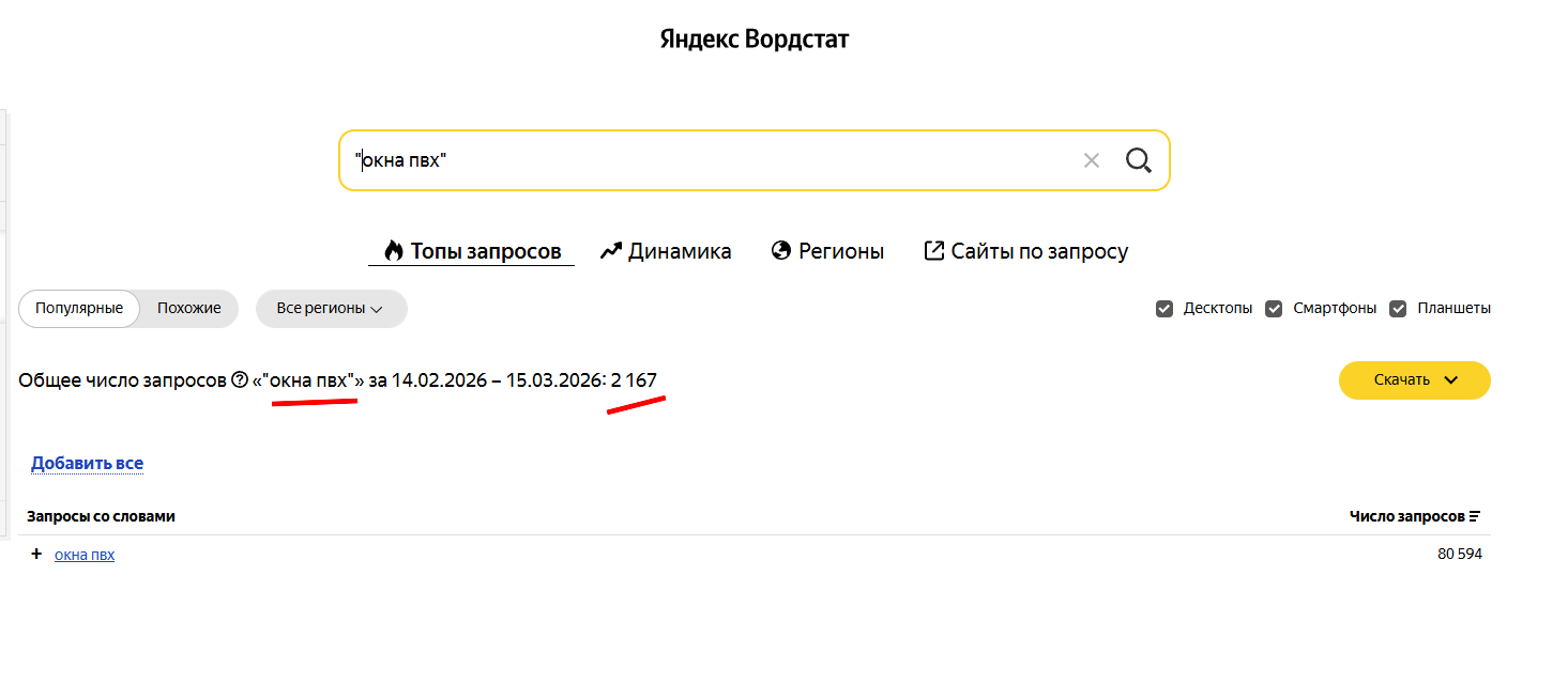 - С кавычками: запрос «окна пвх» покажет частотность только этой фразы в точном соответствии. Это позволяет оценить спрос на общее понятие, но не подходит для сбора семантики.