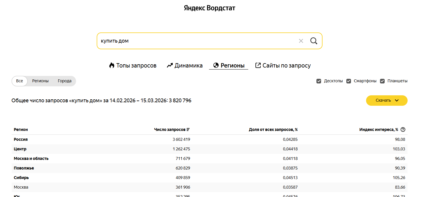 Здесь можно посмотреть статистику по конкретному городу или области. Сервис показывает не только абсолютное число запросов, но и индекс интереса: отношение доли запросов в регионе к доле населения. Если индекс выше 100% - тема в этом регионе сверхпопулярная.