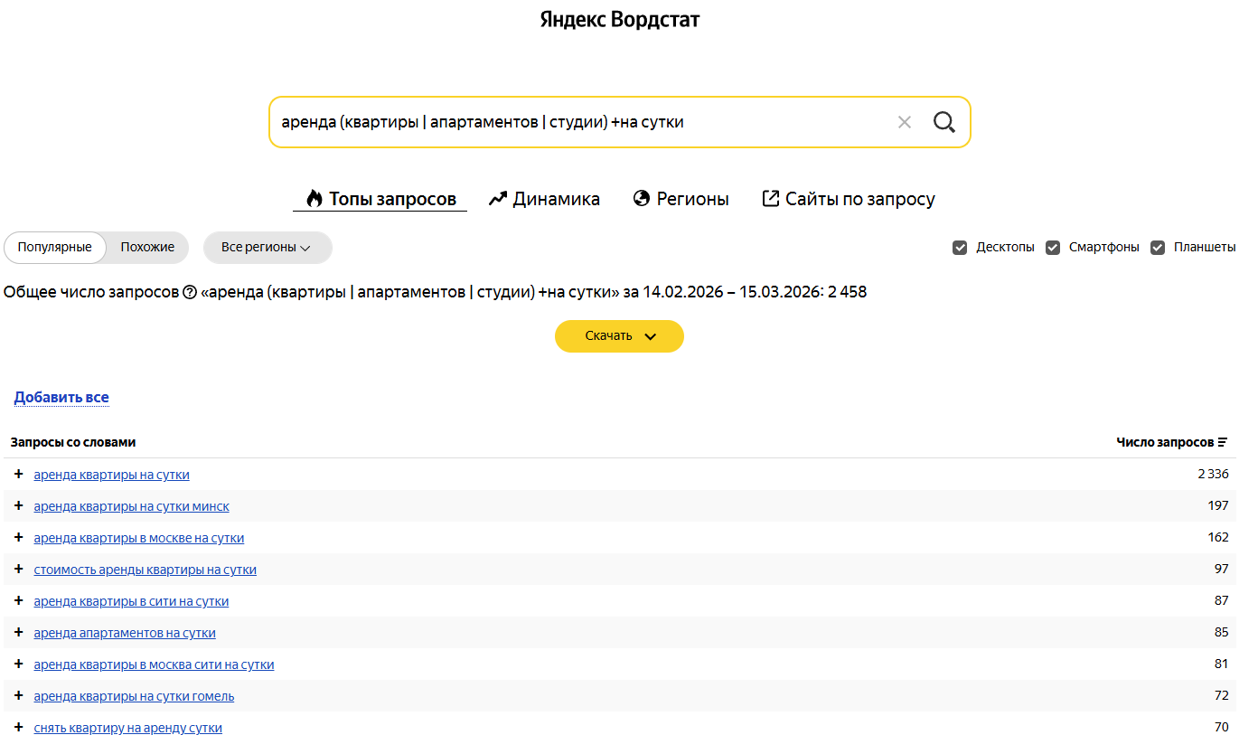 Вертикальная черта внутри скобок позволяет группировать запросы. Это удобно для быстрого подсчета суммарной статистики по нескольким синонимичным фразам. Например, чтобы узнать общий интерес к аренде жилья, можно ввести: аренда (квартиры | апартаментов | студии) +на сутки. Сервис покажет данные по всем фразам внутри скобок.